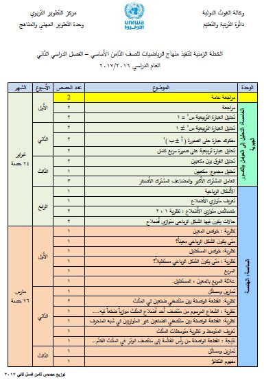خطة فصلية رياضيات للصف الثامن الفصل الثاني 2017 وكالة المكتبة الفلسطينية الشاملة
