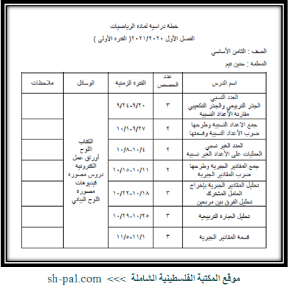 خطة دراسية لمادة الرياضيات الفترة الأولى للصف الثامن الفصل الأول المكتبة الفلسطينية الشاملة