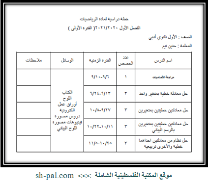 خطة الرياضيات الفترة الأولى للصف الثالث الفصل الأول 2020 2021 المكتبة الفلسطينية الشاملة